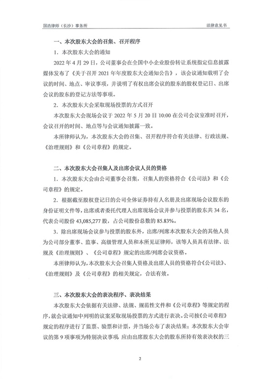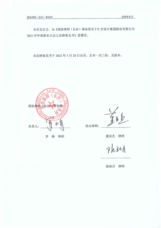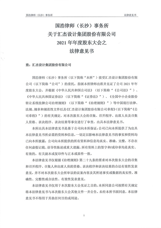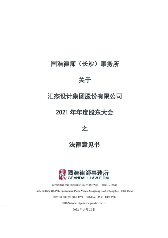 國浩律師(長沙)事務所關于匯杰設計集團股份有限公司2021年年度股東大會之法律意見書